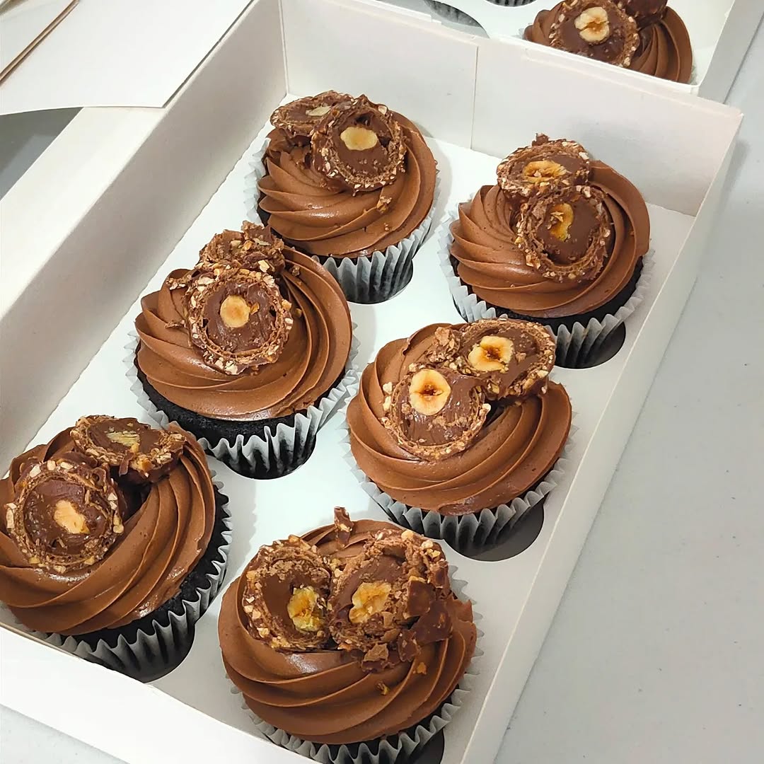 A set of eight indulgent chocolate cupcakes, perfect for the serious cocoa lover. Each cupcake is topped with a generous swirl of silky chocolate buttercream and finished with a whole Ferrero Rocher chocolate. A classic, high-end treat for any small celebration.